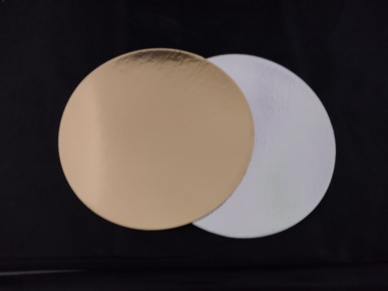500 Tortenunterlagen rund, 18cm, mit fein gewelltem Rand. Beidseitig laminiert (eine Seite Silbe, die andere Gold), Mindeststärke 0,6mm