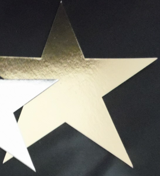 500 Sterne aus beidseitig laminierter Pappe (eine Seite Gold, die andere Silber). Ca. 22cm breit und hoch. Stärke ca. 0,6mm