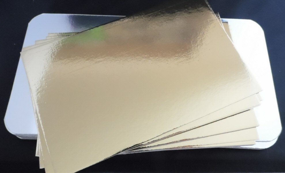30 Rechtecke aus ein- und beidseitig laminierter Pappe (Gold/Silber und Silber). 2x 5 Stück 200x120mm, 2x 5 Stück 400x180mm und 2x 5 Stück im Format DIN A4. Stärke ca. 0,65mm