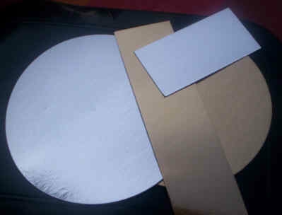 100 Rechtecke und Scheiben aus ein- und beidseitig laminierter Pappe (Gold/Silber und Silber). 2x10 Stück 200x120mm, 2x10 Stück 240x160mm, 2x10 Stück im Format DIN A4, 2x10 Stück rund d= 202mm und 2x10 Stück rund d= 180mm. Stärke ca. 0,65mm