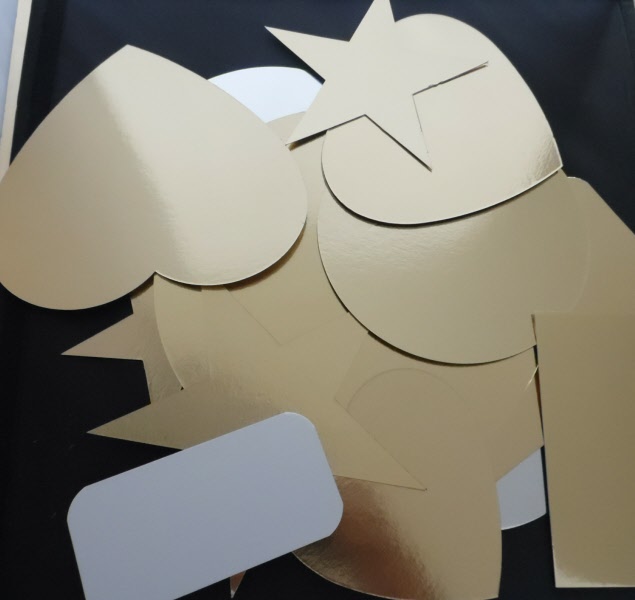 30 Rechtecke, Herzen und Scheiben aus ein- und beidseitig laminierter Pappe (Gold/Silber, Silber). 2x 5 Stück 240x160mm, 2x 5 Stück Herzen 190mm, 2x 5 Stück im rund, 180mm. Stärke ca. 0,65mm