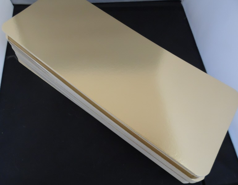 100 Lachsbretter aus beidseitig laminierter Pappe (eine Seite Gold, die andere Silber), 400 x 180mm, mindestens 0,65mm dick