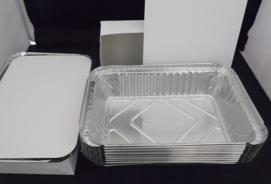 100 Aluschalen R1/240845 (212x147x40mm) mit passenden einseitig laminierten unbedruckten Deckeln und Tragehilfen (Trays/Unterteilen).