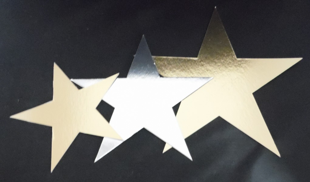 30 Sterne (je 10 Stück 14cm, 18cm und 22cm) aus beidseitig laminierter Pappe (Gold-Silber), Stärke ca. 0,6mm