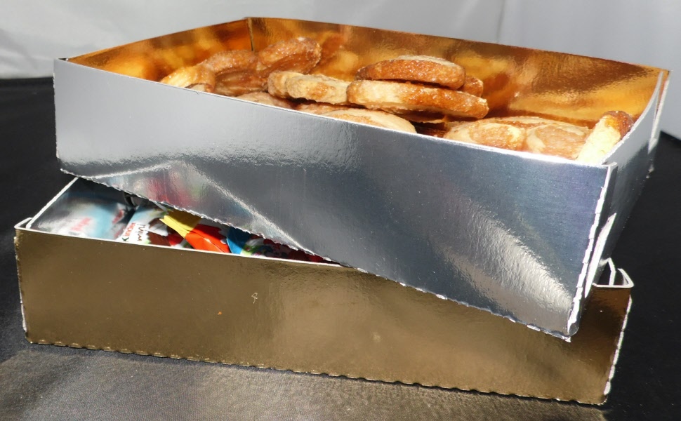 500 Gebäckschalen aus Pappe (135x135x40mm), beidseitig laminiert (Gold - Silber), ca. 0,6mm stark.