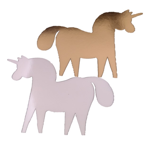 500 Einhörner aus Pappe, beidseitig laminiert (eine Seite Gold, die andere Silber). Größe ca. 23x15cm. Stärke mindestens 0,6mm