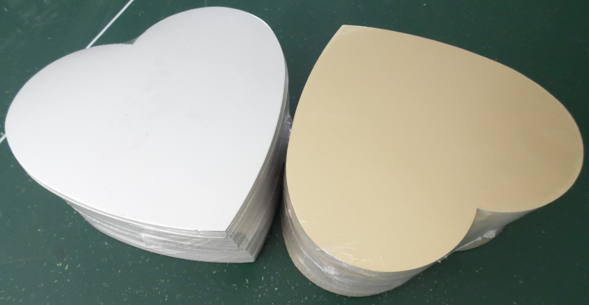 500 Herzen aus beidseitig laminierter Pappe (eine Seite Gold, die andere Silber). Ca. 23cm breit und hoch. Stärke ca. 0,65mm